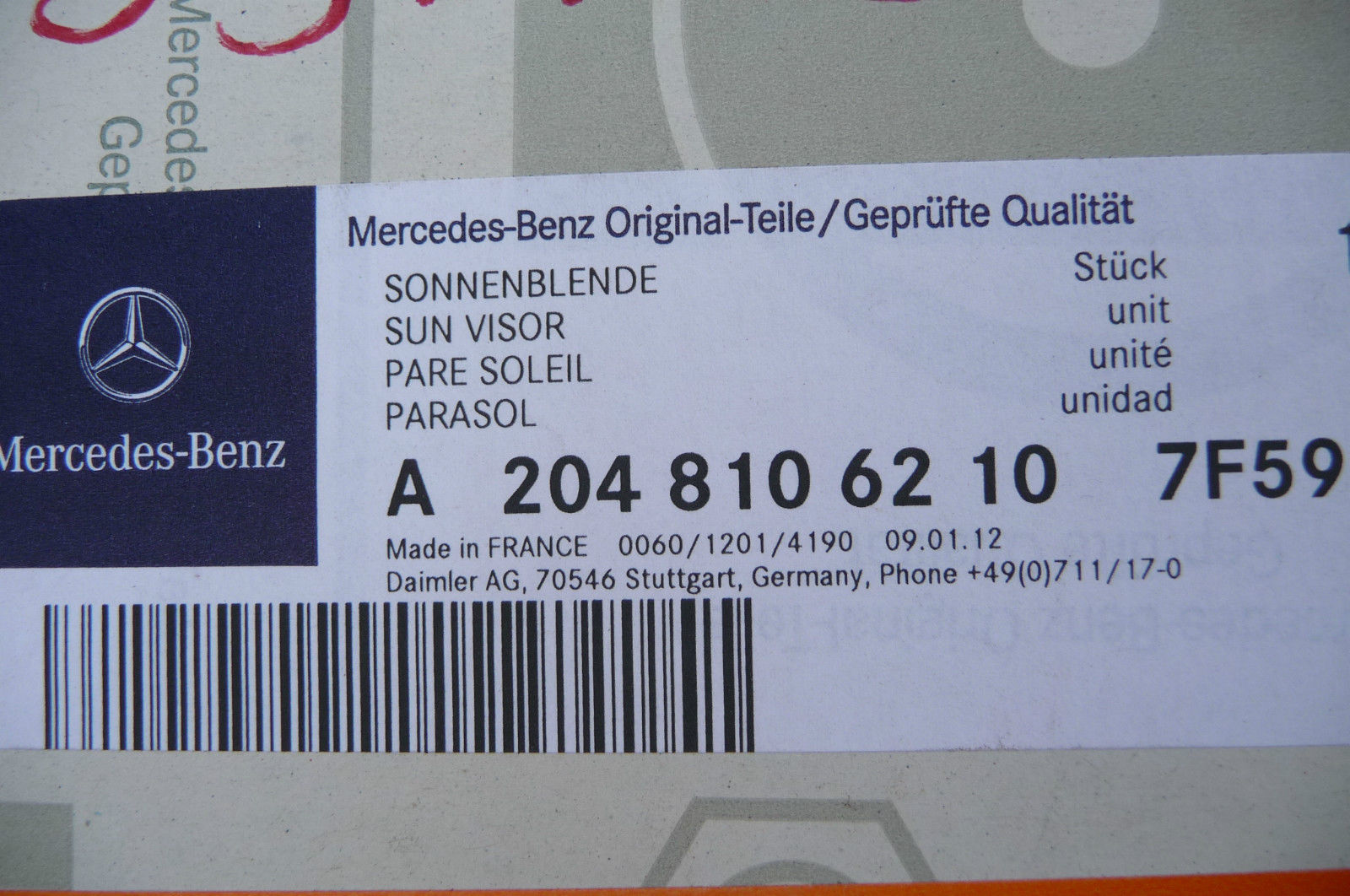 Mercedes Benz W204 GLK350 Sun Visor Right Passenger Side A 2048106210 7F59 OEM