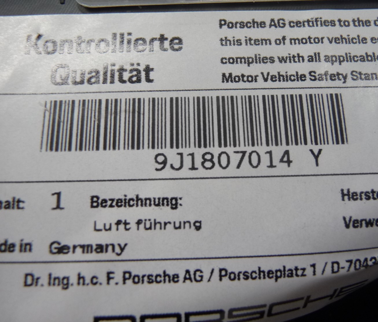 2020-2023 Porsche Taycan Front Left Bumper Brake Air Duct 9J1807014Y OEM A1